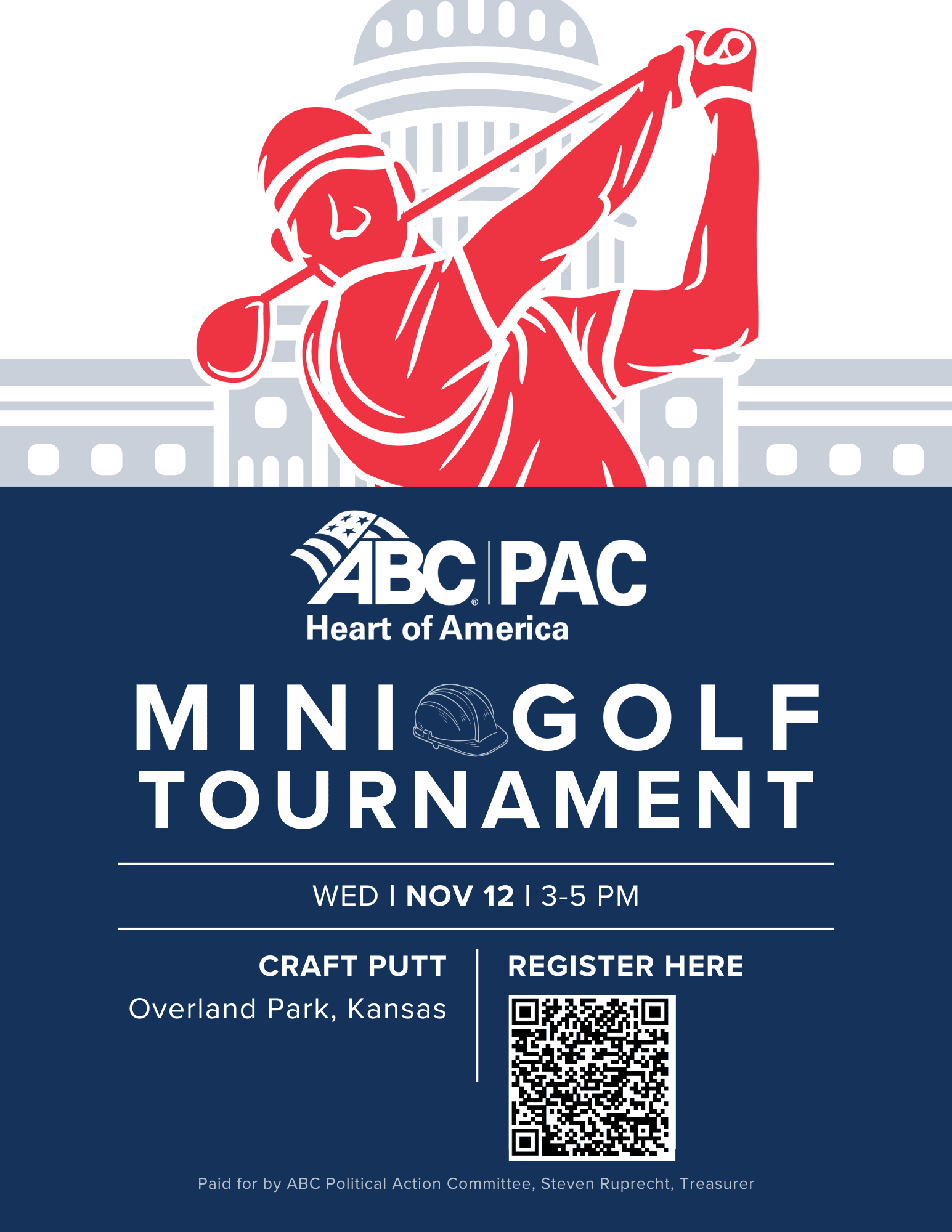 Join ABC Heart of America PAC for a fun afternoon at the Mini Golf Tournament on Wednesday, November 12, from 3–5 PM at Craft Putt in Overland Park, Kansas.